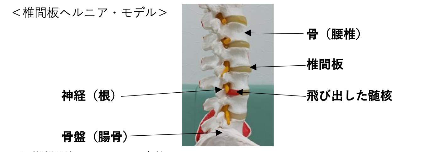 椎間板ヘルニアは背骨(腰椎)の間にあるクッションの役割をする椎間板が潰れて中身(髄核)が飛び出してしまい、神経(根)を圧迫する病気です