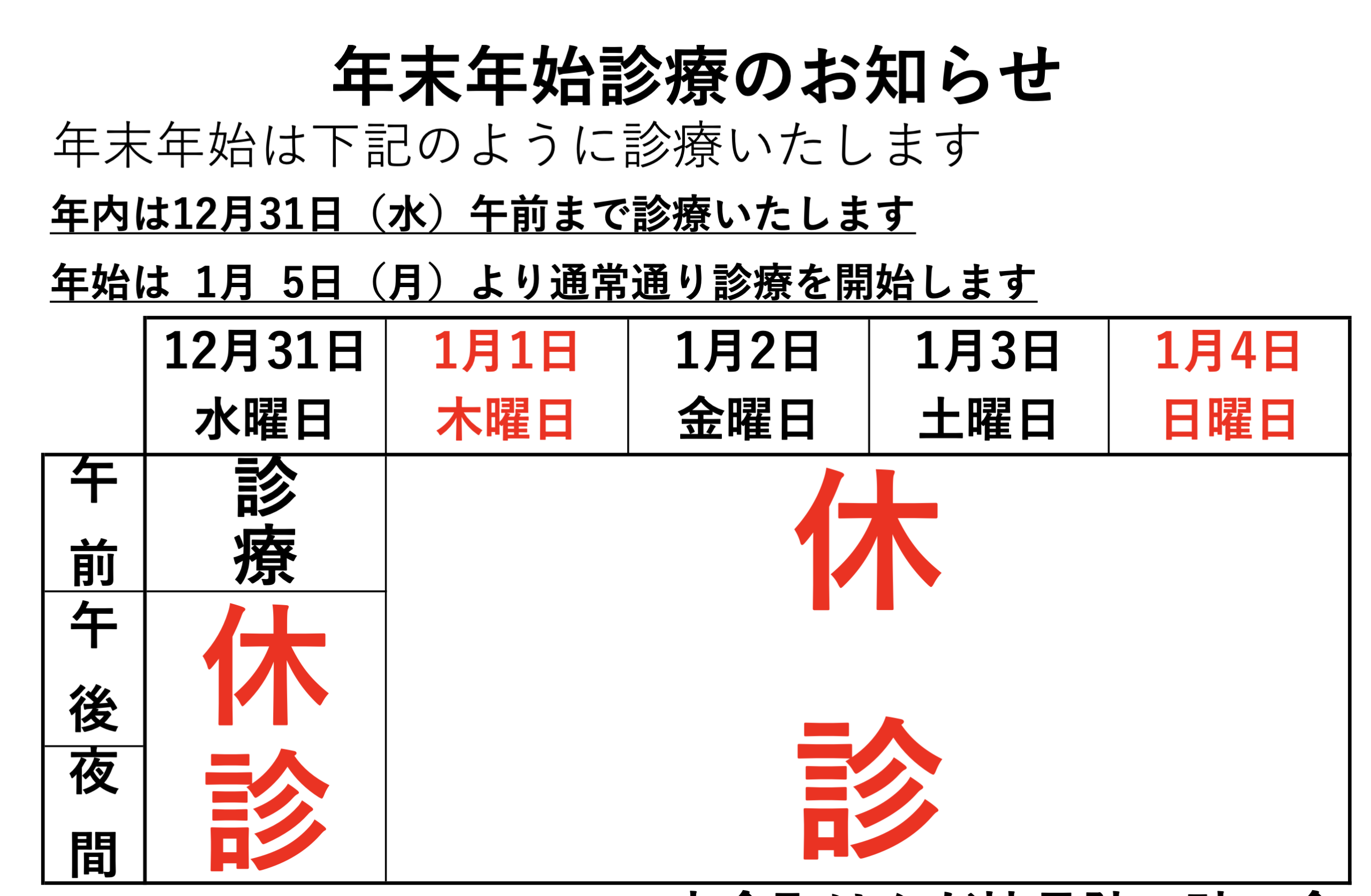 年末年始休診のお知らせ